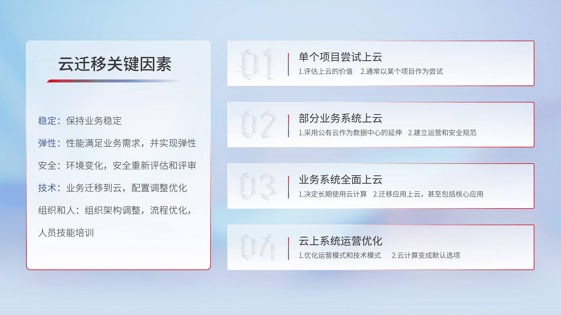 结合实际业务,,,,从规划设计、、、、云平台选型、、、云原生改造、、数据迁移、、、、集成交付,,迁移全过程为客户识别最佳上云路径,,做好风险识别管理,,设计网络架构、、身份权限、、、、安全审计合规、、、、操作审计、、、日志审计、、监控告警策略、、多站点容灾设计等,,,,对云上基础设施进行整体规划,,,,提升IT治理水平,,以满足弹性、、、、高可用、、、、高性能的需求。。。。