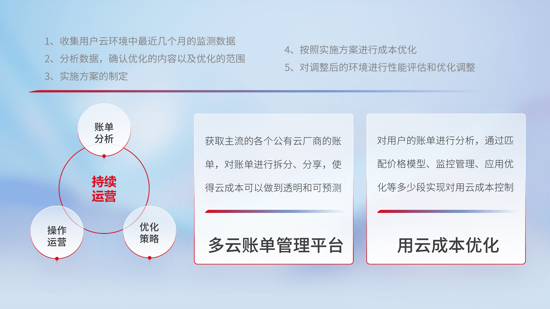 通过多云纳管,,以统一的资源数据模型把客户的云资源进行抽象和封装,,进而实现对多云资源的统一操作,,保障云资源管理的可靠性、、稳定性与可用性。。。量身定制化运维内容,,,,配置、、开发运维、、、、补丁管理、、、、备份、、、监控、、认证和访问管理、、、审计和日常巡检等,,,,保障在用云过程中的可靠度,,,,稳定度以及高可用率。。。